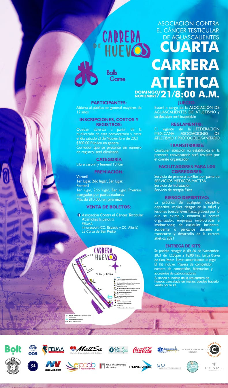Tras el retorno paulatino de las actividades deportivas, uno de los últimos segmentos en retornar, debido a la implementación de los protocolos sanitarios, han sido las carreras atléticas, un evento que ya cuenta con el aval de la Asociación de Atletismo es precisamente la Cuarta Carrera de Huevos, organizada por la Asociación contra el Cáncer Testicular de Aguascalientes, la cual se celebrará este domingo 21 de noviembre a partir de las 8:00 horas.