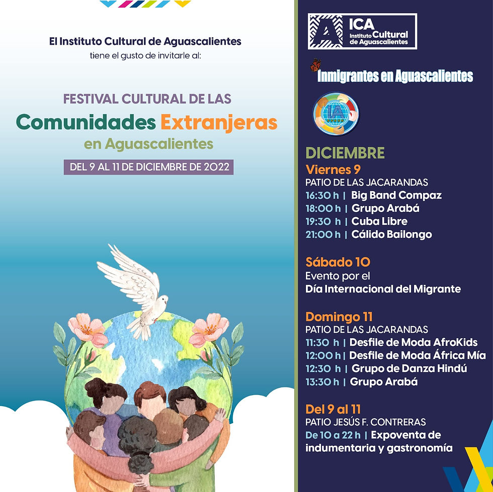 Presentaciones artísticas, pasarelas y la Expoventa de indumentaria y gastronomía de distintos países, son actividades que podrás disfrutar en el Festival Cultural de las Comunidades Extranjeras en Aguascalientes, que se realizará del 9 al 11 de diciembre en el Patio de las Jacarandas, ubicado en el centro histórico de la ciudad.