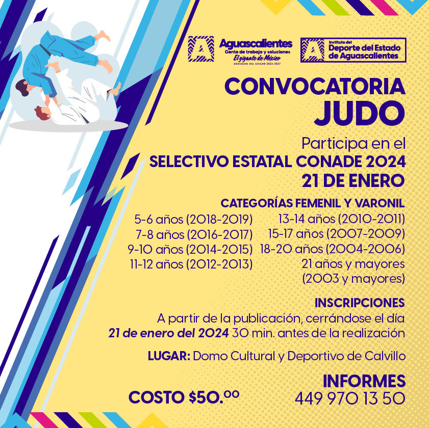 El Instituto del Deporte del Estado de Aguascalientes convoca a jóvenes atletas de 5 años en adelante a participar en el preselectivo estatal de judo rumbo a los Juegos Nacionales Conade 2024 en sus diversas categorías, el domingo 21 de enero en el Poliforum Municipal de Calvillo.