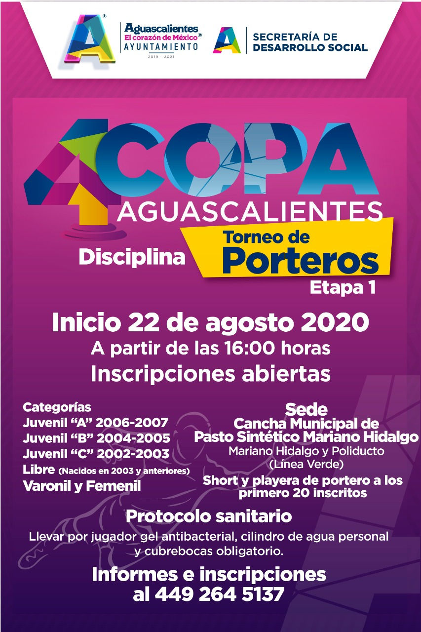 En el marco de la 4ta Copa Aguascalientes, este 22 de agosto se realizará la primera etapa del Torneo de Porteros, a partir de las 16:00 hrs. Las inscripciones continúan abiertas y la actividad se realizará en la nueva cancha de futbol municipal de pasto sintético ubicada en la Av. Mariano Hidalgo y Av. Poliducto en el Fracc. Solidaridad IV.