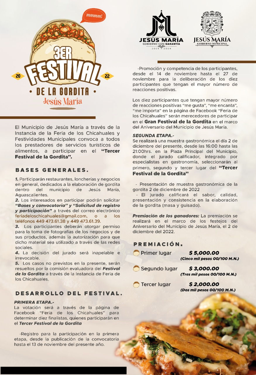 El Municipio de Jesús maría a través de la Instancia de la Feria de los Chicahuales y Festividades Municipales, invita a participar en el Tercer Festival de la Gordita para el cual, ya está abierta la convocatoria y misma que cerrará el próximo 13 de noviembre.